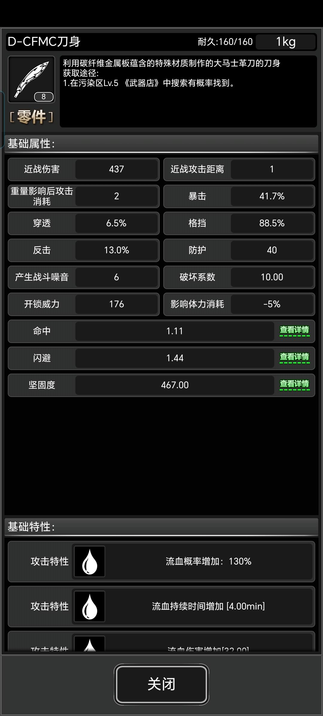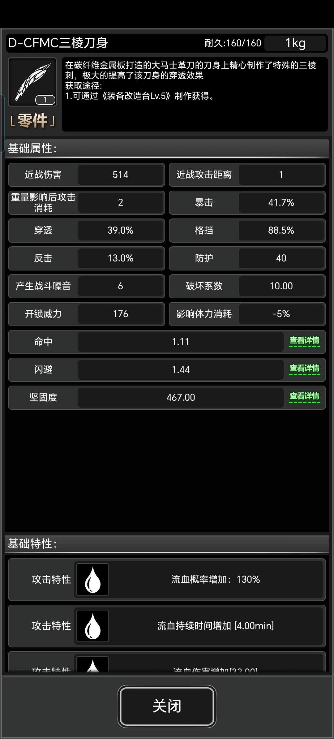 满级加成:近战伤害+140;近战攻击消耗-7%;命中+0.14;流血概率+35%;流血伤害+21;姿态体力消耗-7%