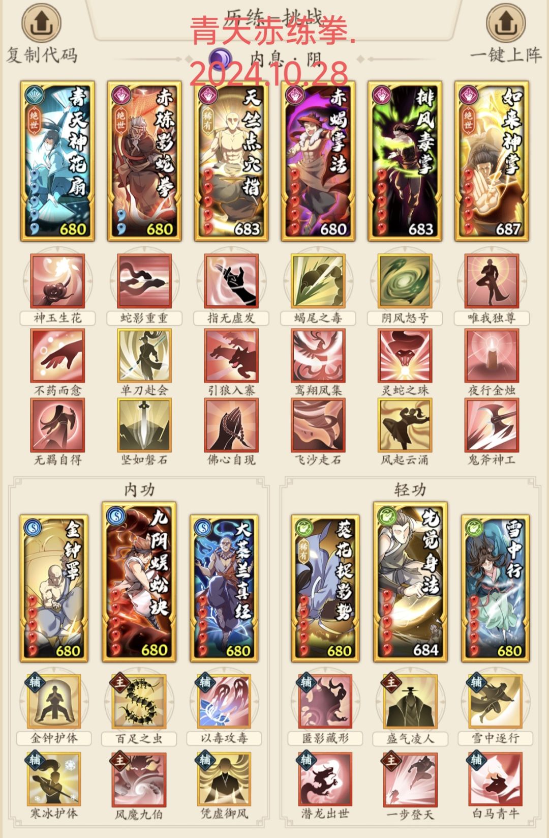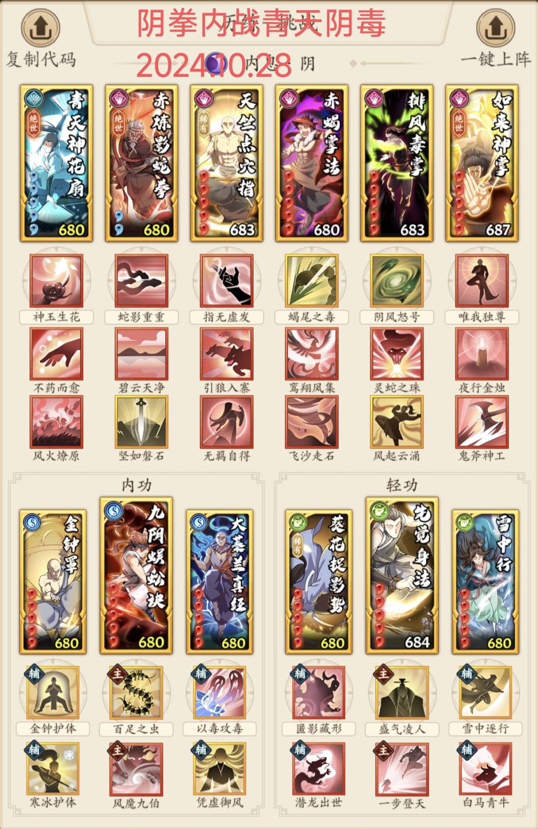 5.感怀今夕非必须,可自行替换控制招式临危不惧或者回复招式生生不息,这个位置卡个感怀今夕,主要是为了那55%化劲和抵挡招式伤害(点名三板斧阳直这位置没感怀今夕+磐石,可能你见不到第四招你就无了)