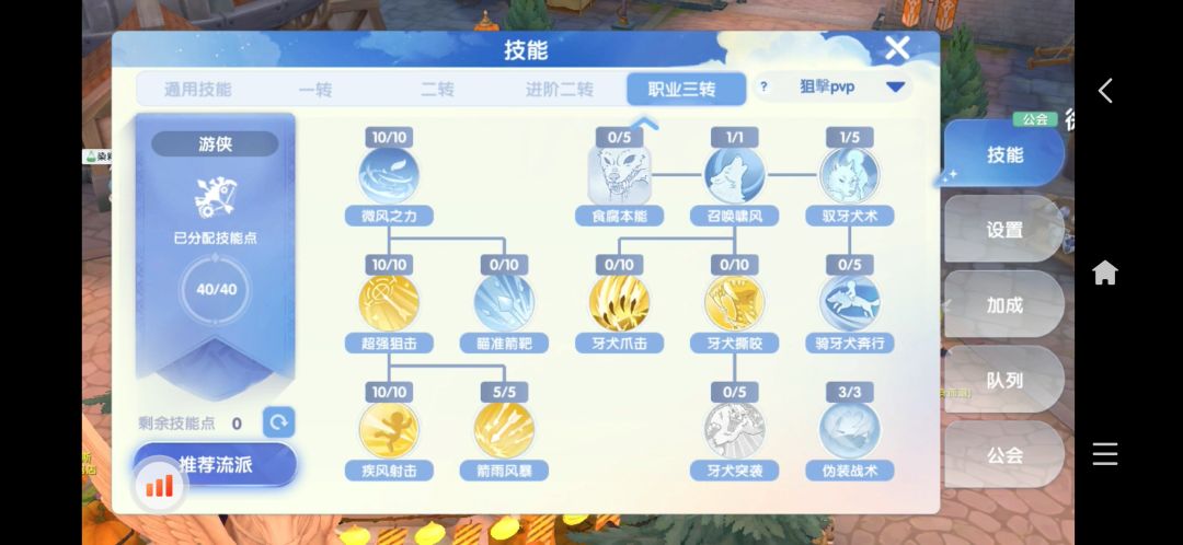 二連矢10,箭雨10(為後續箭雨風暴增加傷害),鶚梟之眼10,蒼鷹之眼10,心神凝聚10,動物破壞者10,獵鷹尋敵,箭矢修煉10,強化二連矢10,狙殺瞄準10,風之步5,微風之力10,超強狙擊10,疾風射擊10,箭雨風暴5,偽裝戰術3,召喚嘯風1,其他隨意。(食腐本能可以讓嘯風在掛機時回血,減少召喚次數;馭牙犬術雖然跑路快,但是有前搖,不點也可以,有風之步即可)
