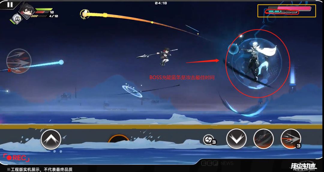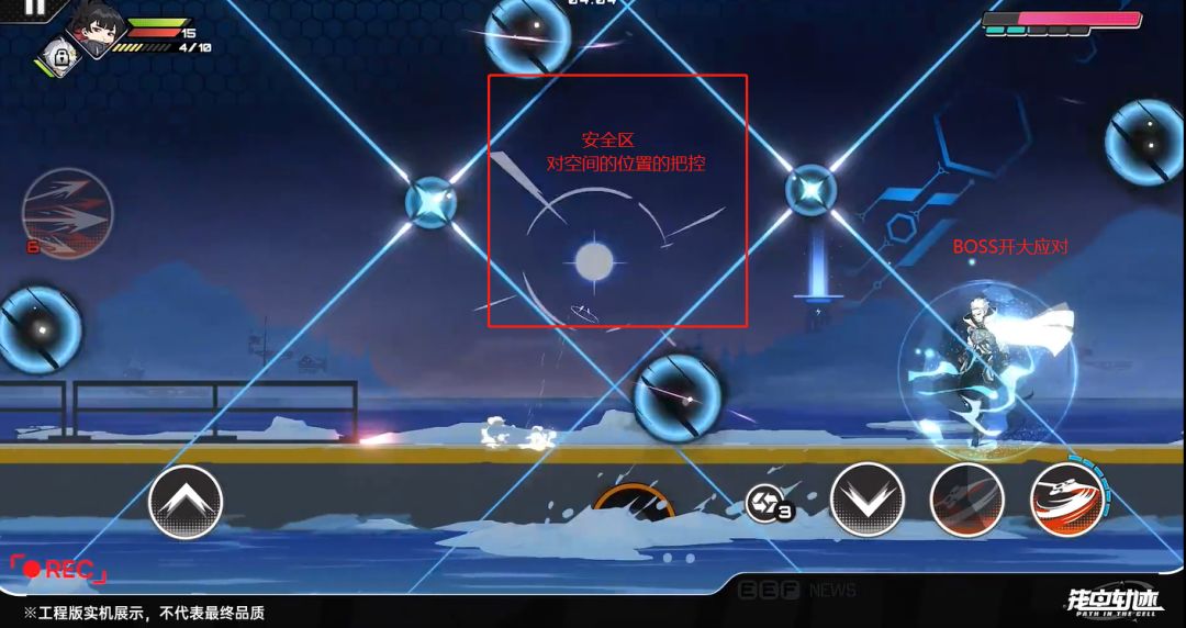 4、BOSS进入充能恢复蓝条时,是角色攻击最佳手段,BOSS充能完毕后会开大,空间充满光球,进行空间线性攻击,关键躲避手段,跳跃到安全空间区域,减少受到伤害。