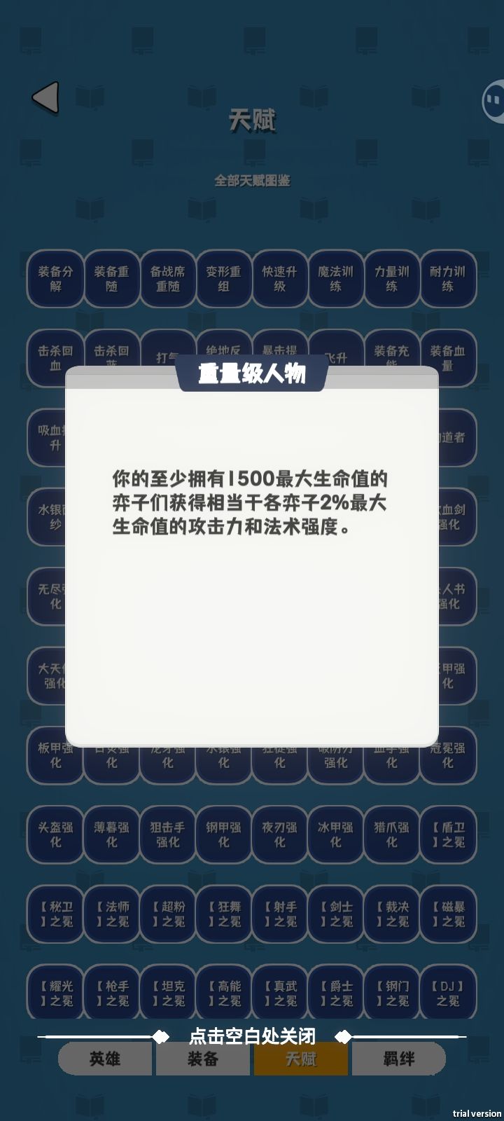 buff的话,“重量级人物”一定要有,还有免控减伤类的。前期养虫子的那一套,就是各种回蓝buff。最后就是一些不吃装备强化人物的buff,飞升之类的。