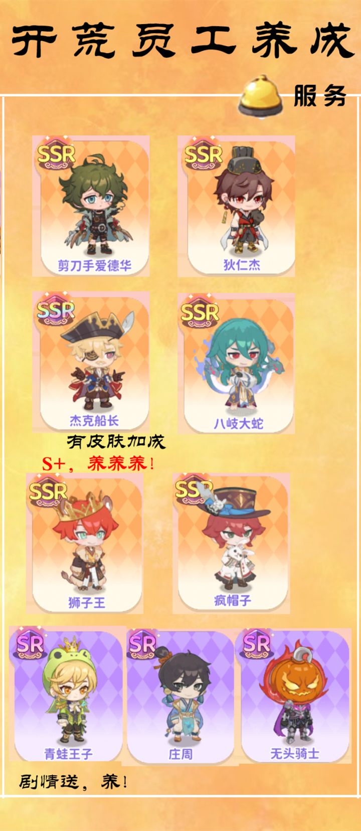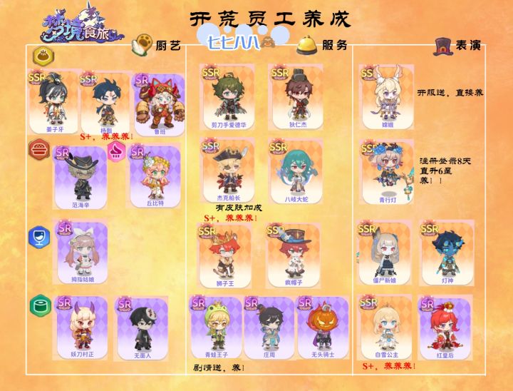 3.游戏第一天会送SSR嫦娥,属于表演职业,游戏签到第2天会送青行灯,第8天会升至5星。青行灯也属于表演职业。所以表演先养这2个员工就够了。