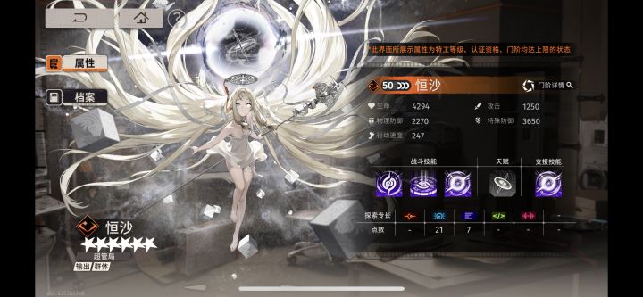 情性特攻角色,被动:虚无状态结束后对所有人造成15%伤害,增加20初始能级。普攻倍率中等,有15%概率获得10能级,只能说聊胜于无。战术技是核心技能,消耗20能级对单体造成2段伤害,处于虚无状态时不消耗能级造成4段伤害,倍率极高(相当于很多角色大招)且每段伤害都会造成5%减防,这导致恒沙还有很强的辅助能力(特攻版龙井)大招对自身造成最大生命百分比的自伤并对全体造成特殊伤害,倍率较低。同时进入虚无状态持续两回合(1命增加一回合)