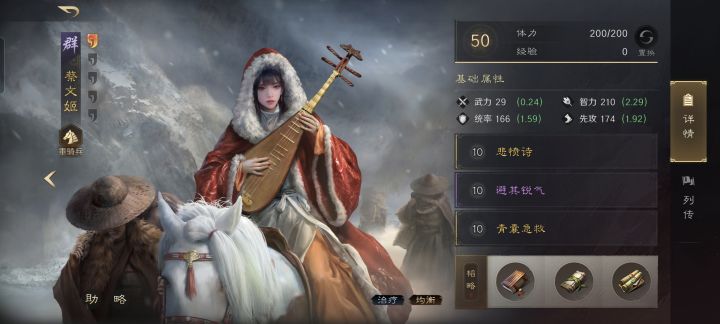 悲愤诗在游戏里是主动战法,故而蔡文姬选择重骑兵并点亮骁勇善战可谓是最佳方案,既收获了高额统率值,还配合着专属金书,把悲愤诗的发动率总共提升到了80%。