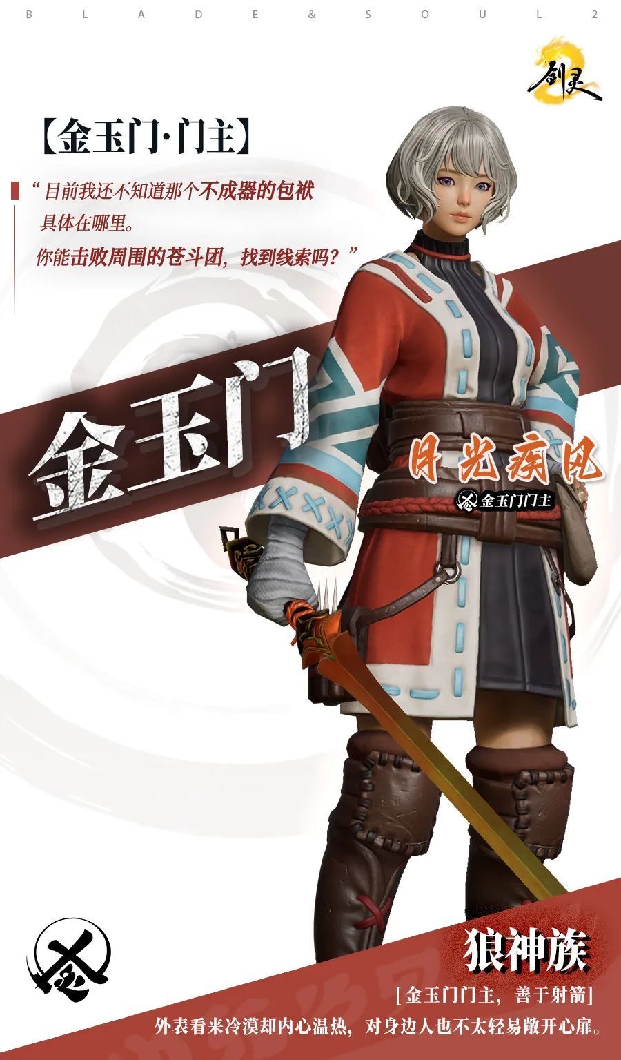 月光疾风,金玉门的现任门主,她的身世充满了传奇色彩。作为前任门主与狼神族族长之女的她,因有人类血脉与狼神族的长相,在狼神族和人类两边都备受排斥。因为这样的经历,她对身边的人不容易敞开心扉。