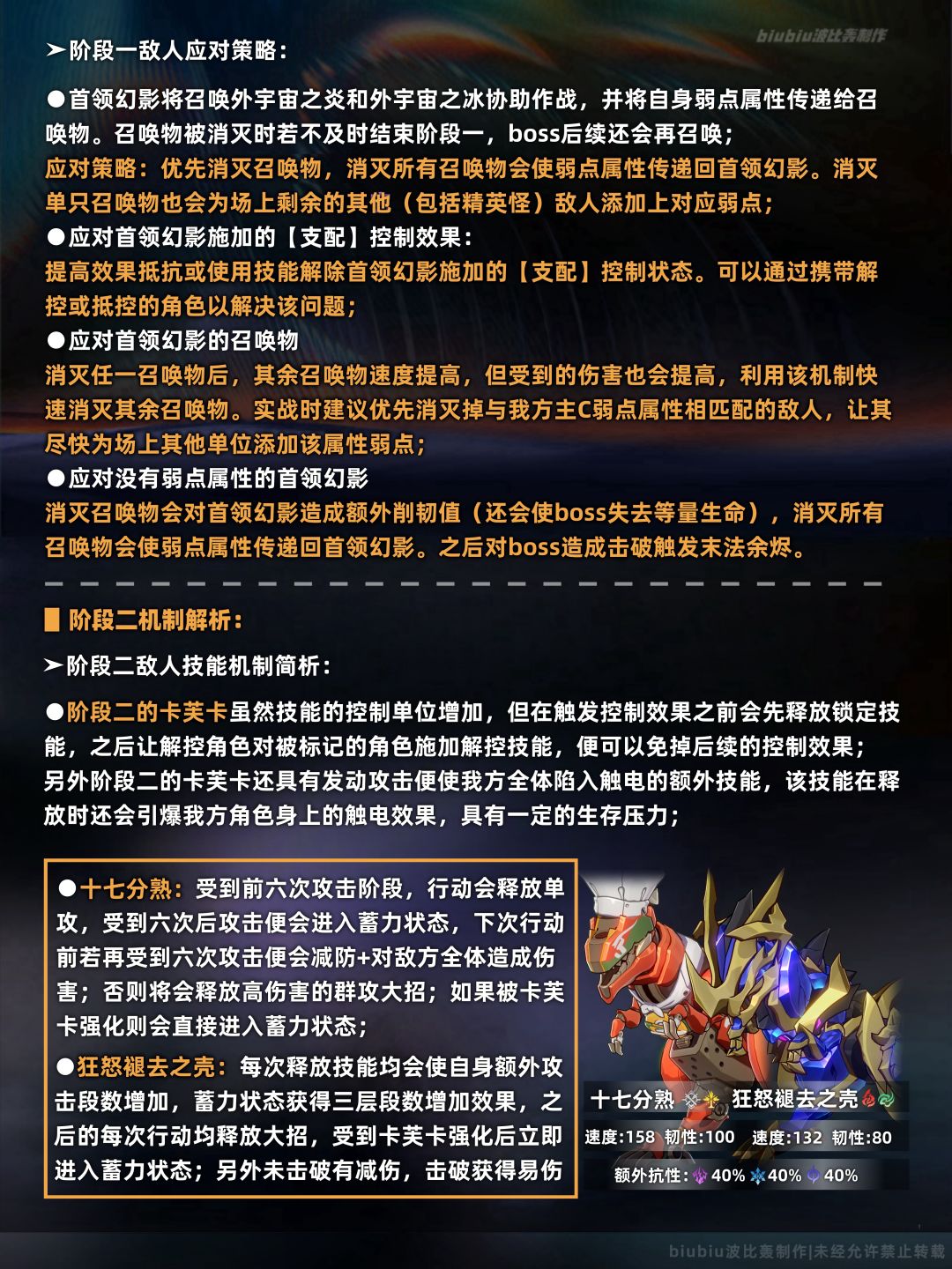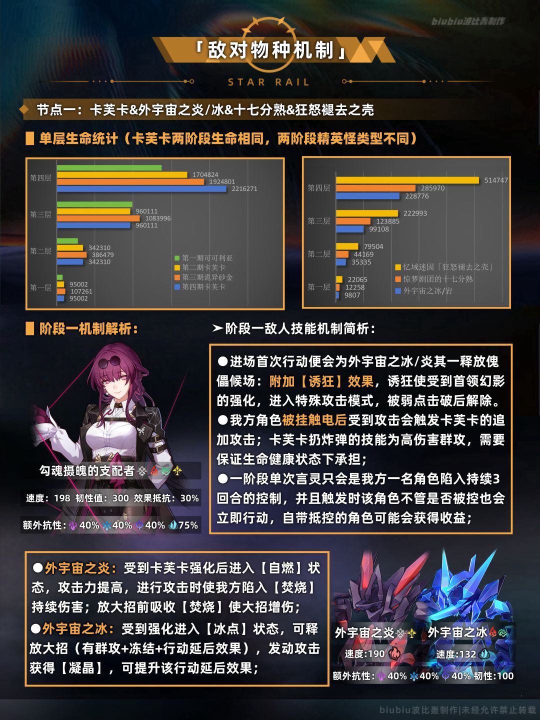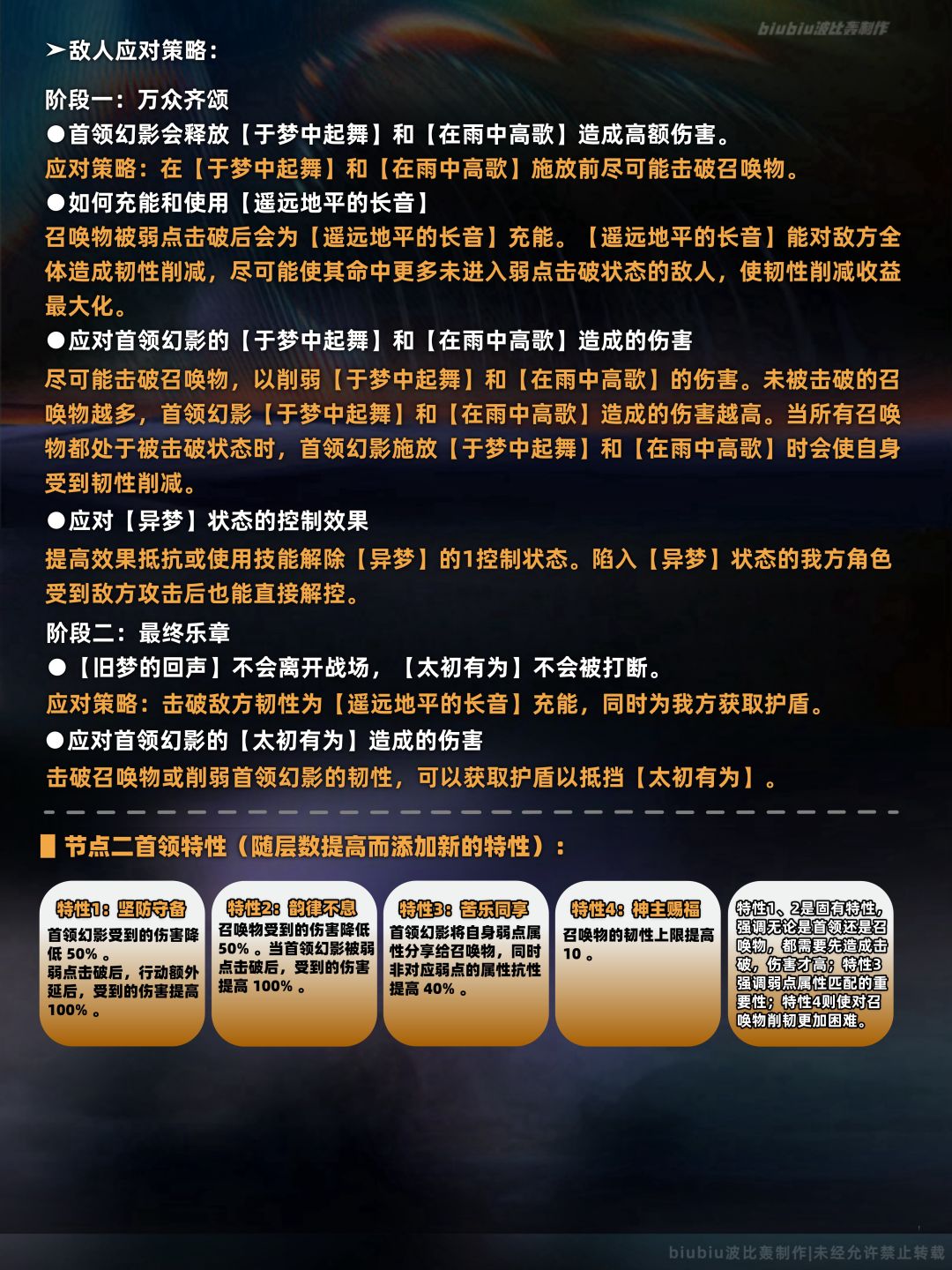 本期节点一(上半)的敌人与第二期一模一样(首领特性也一样),并且应对策略也如出一辙,改变的地方是本期第四层生命值相较于第一第二期大幅提高,对于队伍的输出要求更高,难度更大;其中注意十七分熟大招伤害极高,建议选合适配队(如DOT、追击等)尽快使其叠层,中断大招释放;