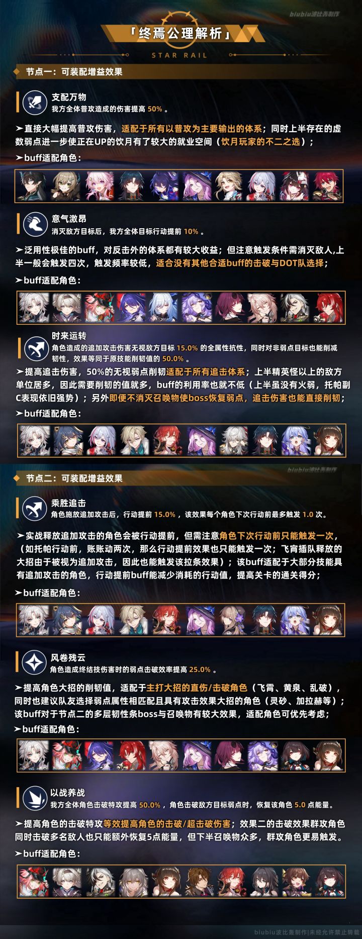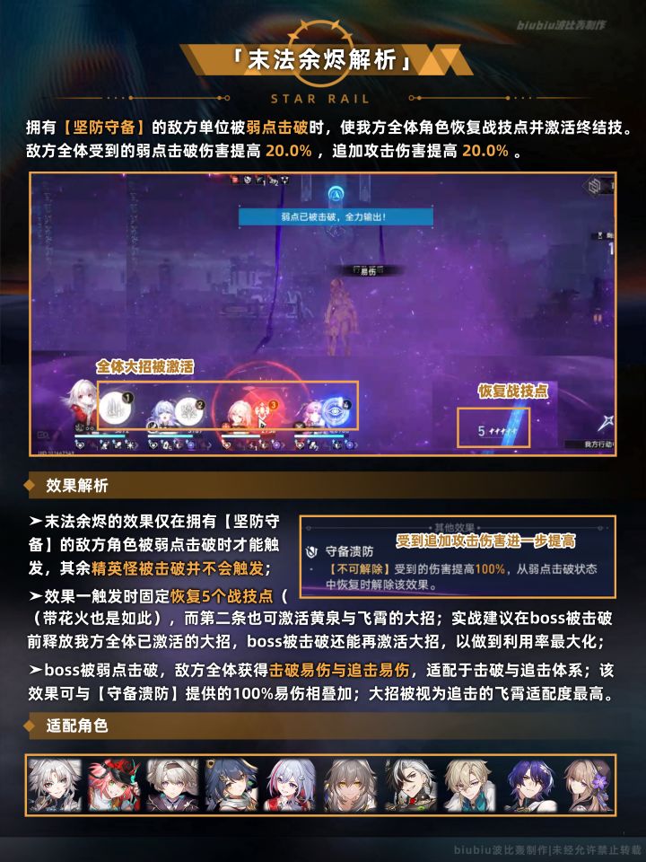 总体来说本期末日幻影的水温有所提高,环境上较适配于追加攻击体系与击破体系;虽然敌方的生命值有所提高,但本期仍然有消灭召唤物对boss削韧+扣除生命的机制,因此难度依旧没提高很多;如果没有练击破体系,也可考虑将知更鸟留到下半,全队多动更利于利用下半boss机制;击破体系仍是现版本主流,同谐主培养价值依旧不低;