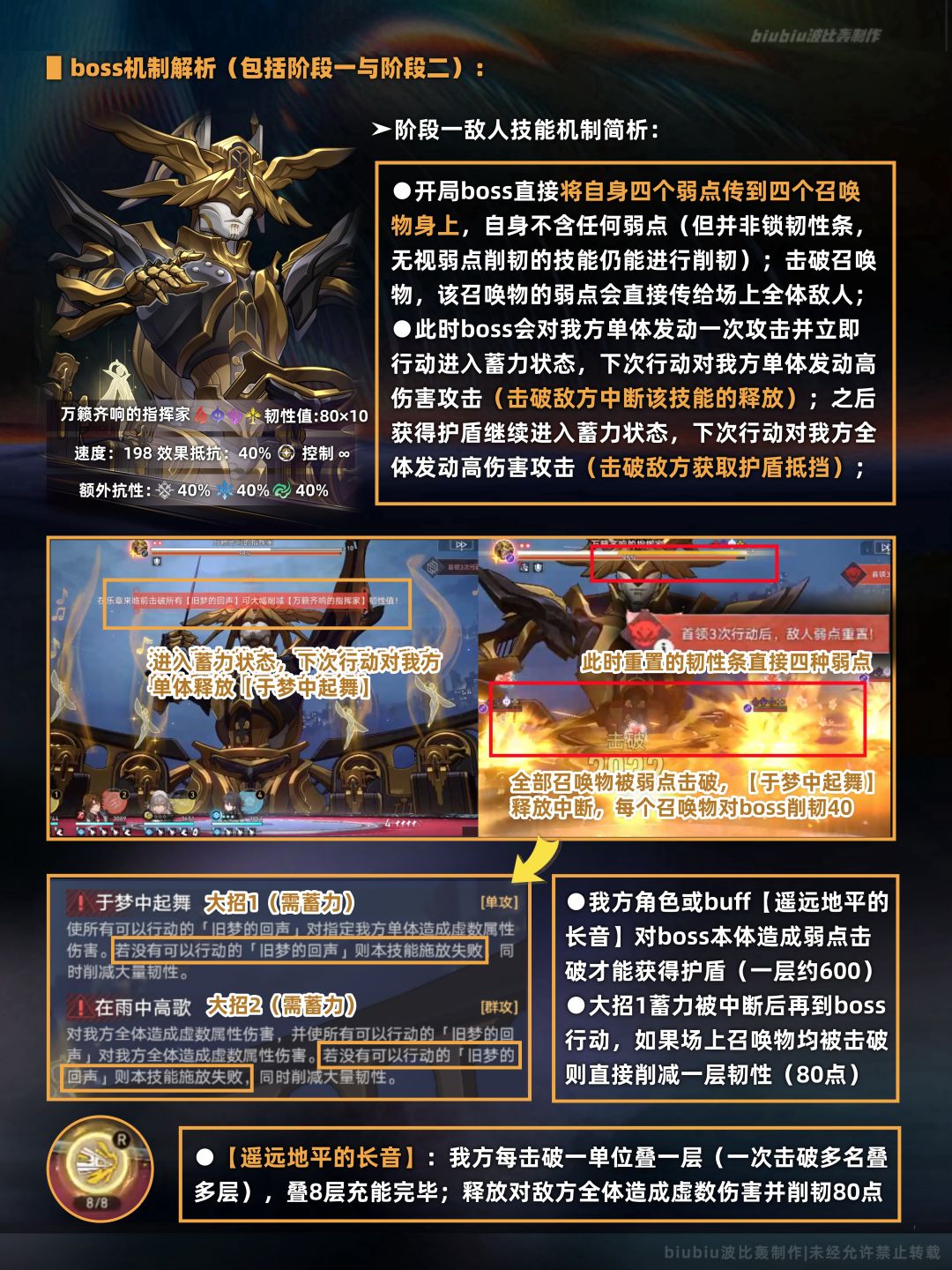 下半buff2与buff3均利好击破体系,其中由于敌方召唤物铺满全场,群攻角色乱破最佳;实战可以先将弱点属性与主C相匹配的召唤物击破,为敌方全体挂上该弱点(如乱破超击破中,在乱破释放大招前让同谐主对最右侧虚数韧性的召唤物放战技,使其弱点被击破,将虚数弱点传递到敌方全体,这样后续行动的乱破大招就能对敌方全体进行削韧);之后集中对小怪造成弱点击破,以削弱boss大招并使boss获得削韧;由于存在击破使我方获得护盾的机制,这样可以携带高削韧的角色,即便不带生存位也可以用该护盾获得生存能力;