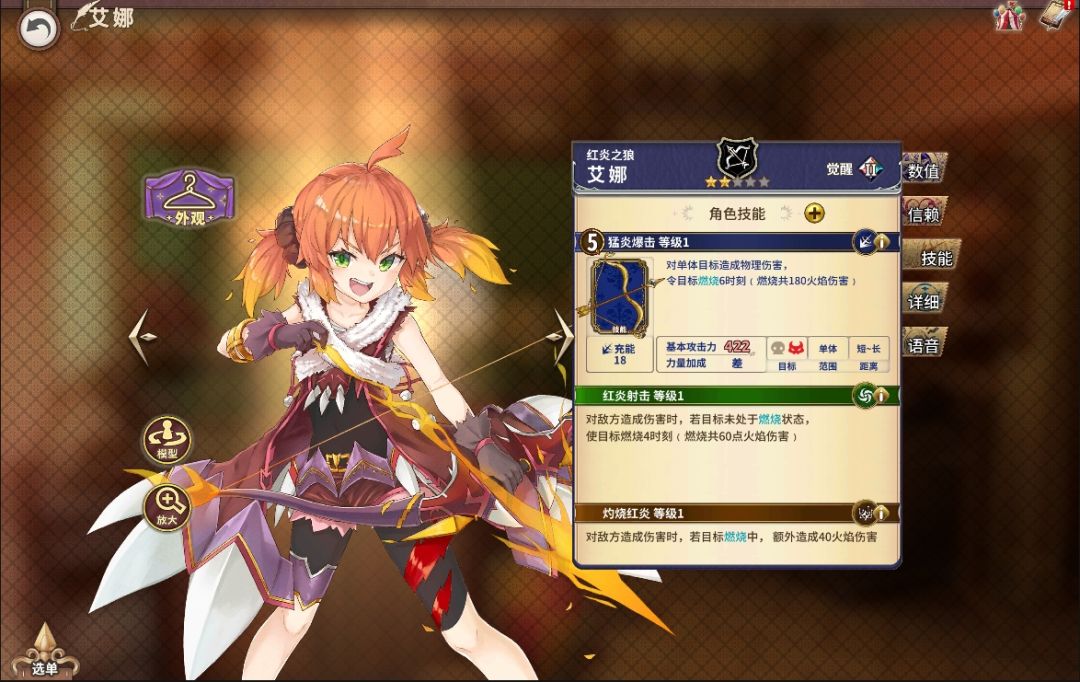 奥义“猛炎爆击”可以对范围内敌人造成物理伤害,并附带燃烧效果(满级时燃烧6时刻造成共1080点火焰伤害)。技能“红炎射击”可以对未处于燃烧状态的敌人造成伤害并添加燃烧效果(满级时使目标燃烧4时刻,并造成540点火焰伤害)。技能“灼烧红炎”可以对处于燃烧状态中的敌人额外造成火焰伤害(满级时360点)。