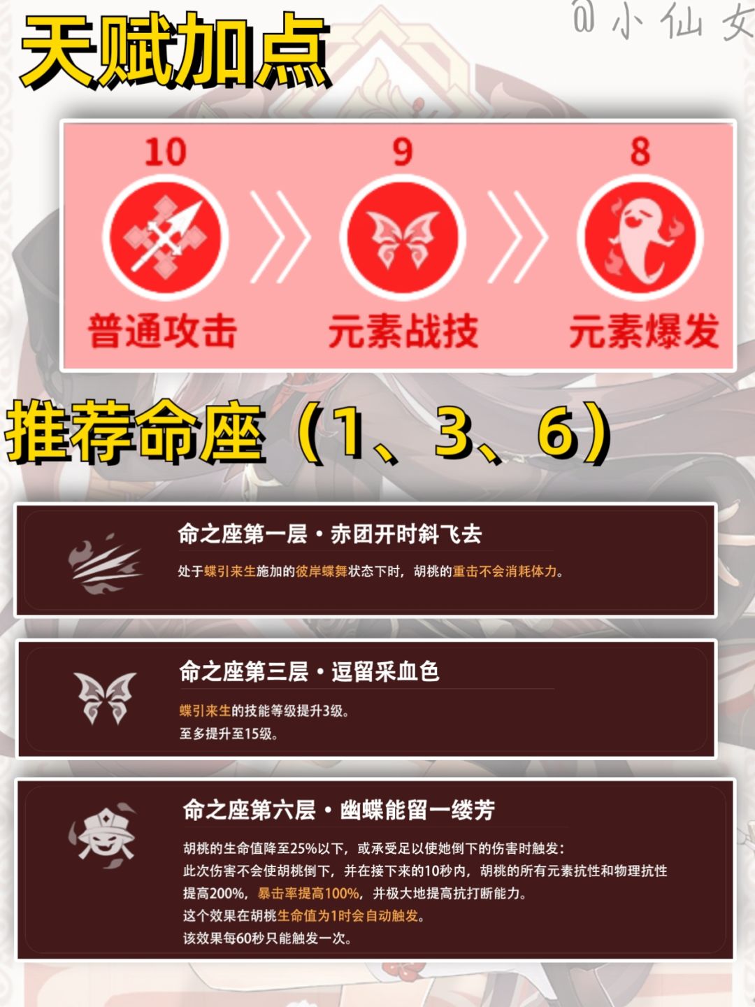 总结——胡桃是一位能通过生命值转化大量攻击力、通过重击实现高频率蒸发、通过高倍率大招完成爆发的具有出色的输出能力的近战站场主C型角色,但是需要特别注意的是胡桃的输出受到操作的上下限影响非常大,1命对于手感和输出的影响也比较大,同时最佳配队比较固定需要合适的队友才能发挥全部实力,即经典的胡行钟体系(胡桃,行秋,钟离)。