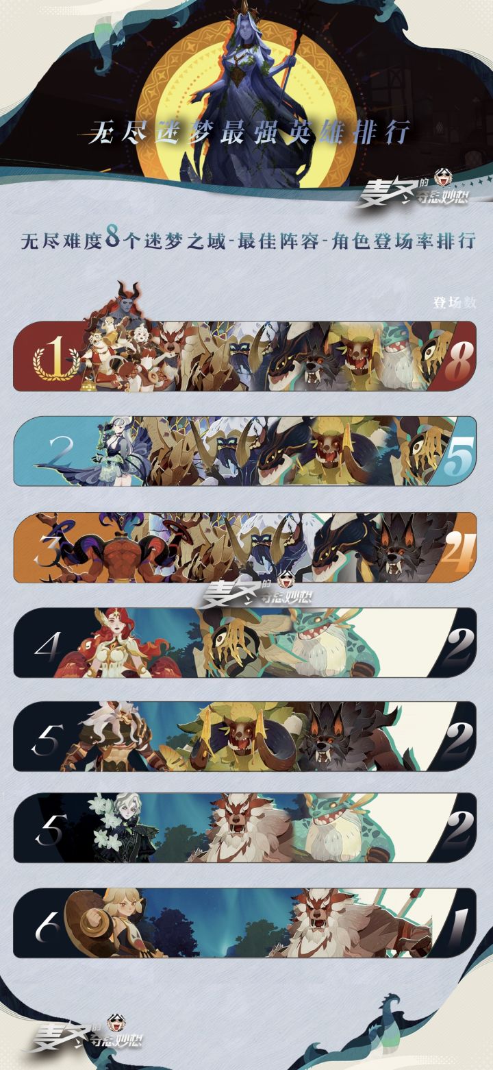 仅以伤害最高的阵容名单进行汇总,如果后续阵容变化会定期更新,目前奶爸、蝎子和曼卡拉在无尽难度都是全勤,并列第一。