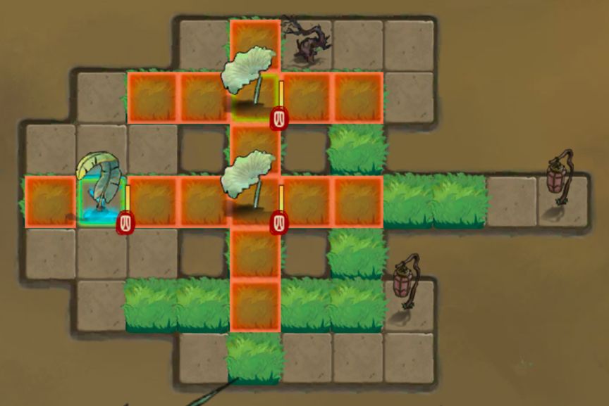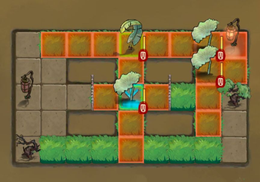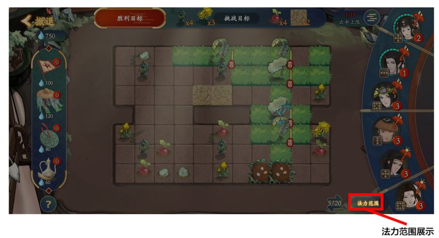 (另一组示例,在把芭蕉伞从上方挪到下方后,原本右上角的荷叶伞因为断开了法力链接因此失效了,由于类似这样每一步的操作都有可能带来影响,因此困惑的时候谁时都可以去查看当前的法力范围)