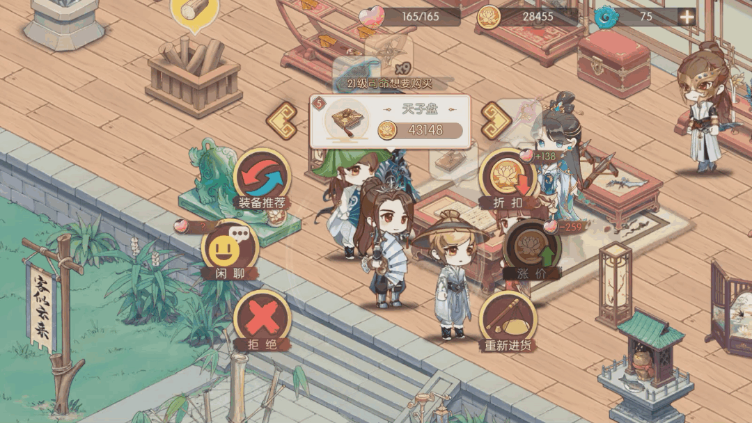 点击顾客的需求小气泡,可以和玩家闲谈、涨价、降价、推荐其他商品、拒绝和出售。