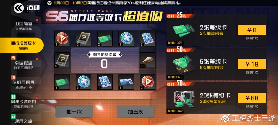 在活动界面购买通行证等级卡享受折扣特权,并获得抽奖机会,购买数量越多折扣返利越高;