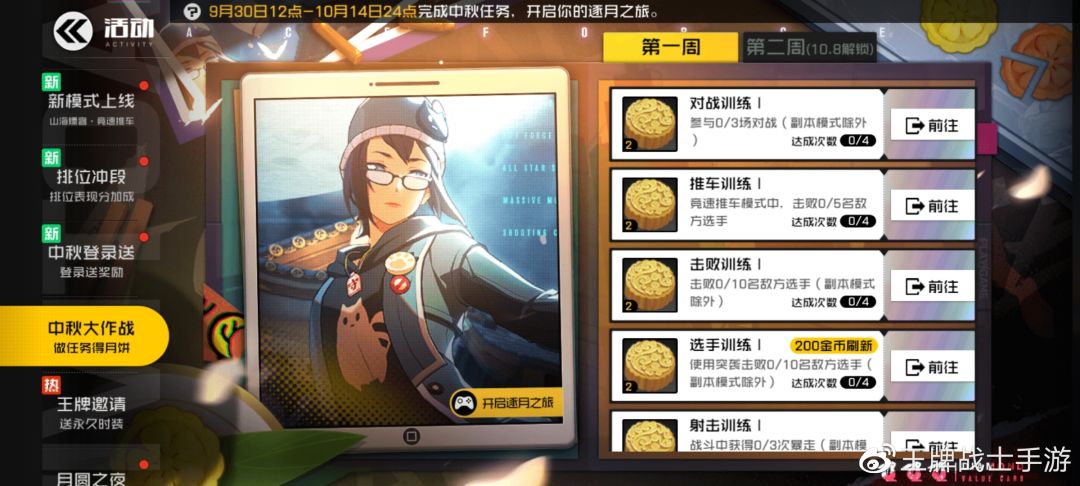 活动任务分两周解锁,完成任务领取月饼,月饼同时也是逐月之旅活动的消耗道具。