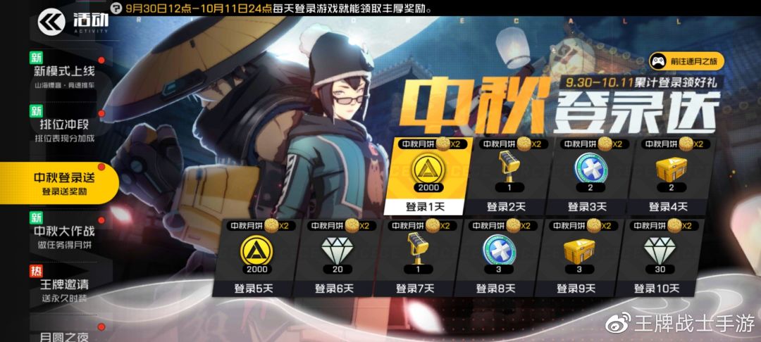 玩家根据累计登录的天数领取奖励,每天固定领取月饼X2,月饼用于逐月之旅活动;