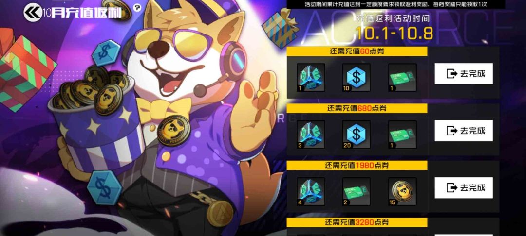 活动期间累计充值达到活动条件后可领取时空之骰、柴吉币、通行证等级卡、点券等奖励。