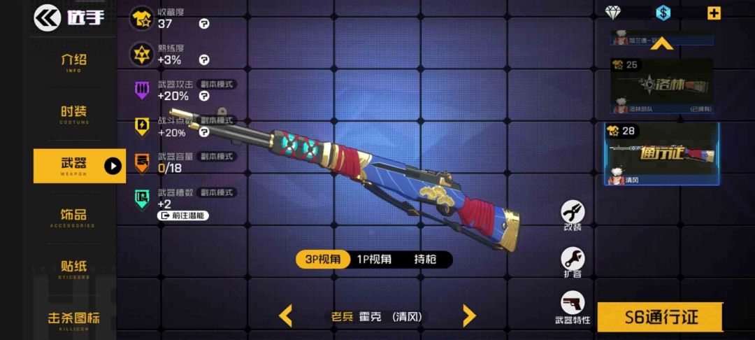 武器特性:收藏度28,单局选手熟练度+3%,副本模式攻击+20%,副本模式战斗点数+20%,副本模式武器容量+18,副本模式武器槽数+2