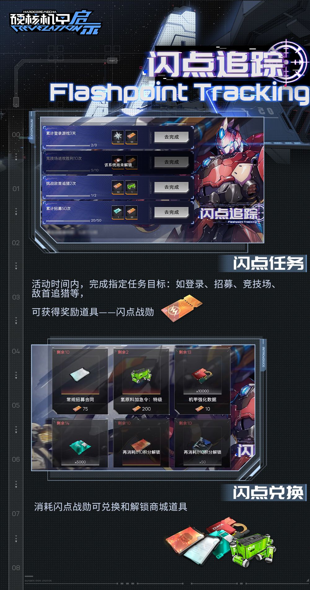 【闪点战勋】道具可兑换【限定招募合同】、【最终武装访问许可】、【SSR级机甲核心零件】等一系列丰厚奖励。