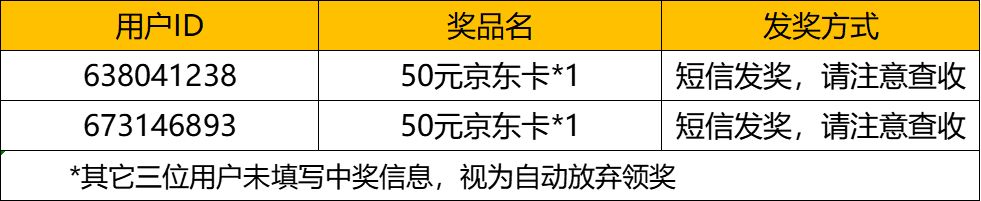 恭喜下方两位玩家中奖,相关奖品(50元京东卡卡密)已通过短信方式发奖,请注意查收!