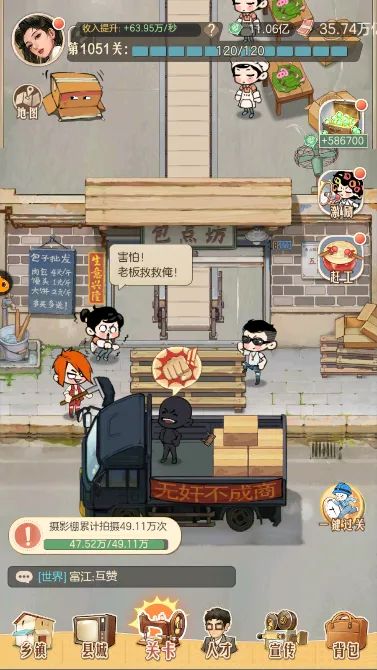 关卡位于游戏正下方,进入关卡后,完成招工——培训——与奸商对决,即为通关,总的来说类似于做游戏内的主线任务,跟随主线一路推关。