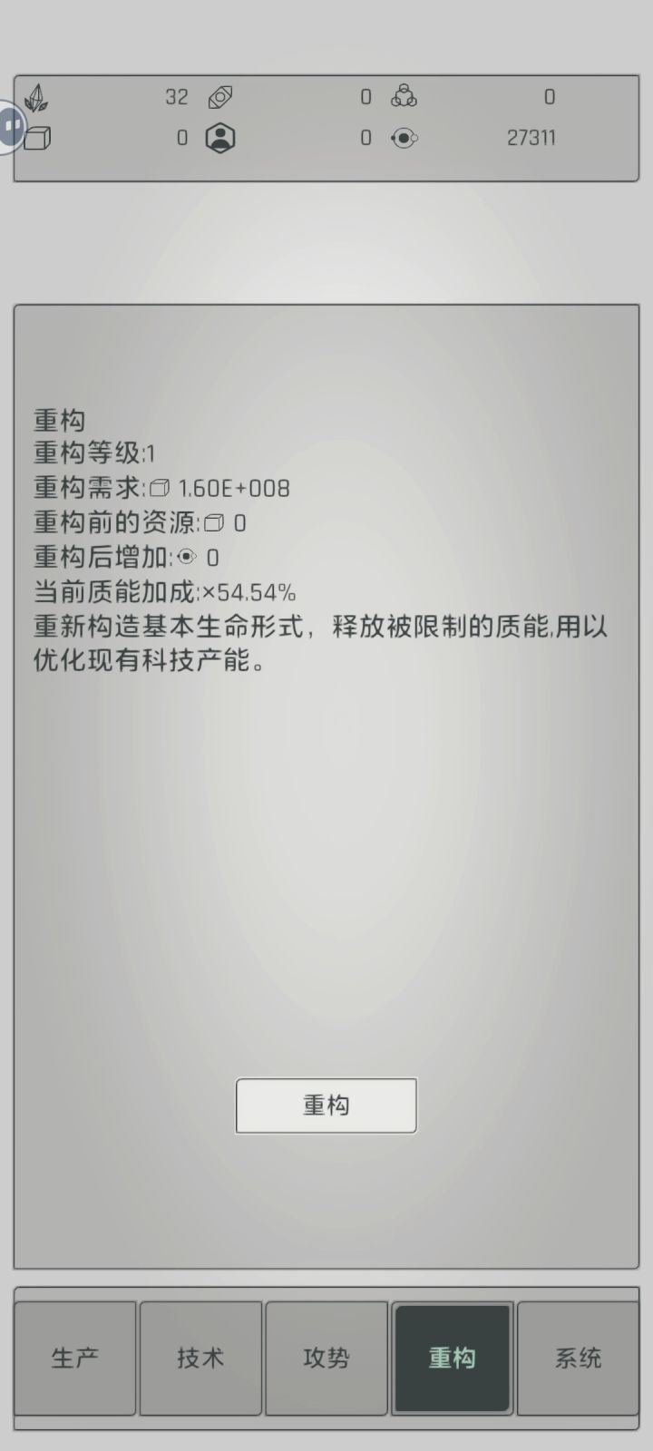 科技要赶紧更新,要不这样的数据还真不想玩,全靠最后的可以点到80万的 一下16w 后用连点器点了一天,才第一次重构,结果数据就这些,完全不平衡,科技跟不上,完全就是各种卡,不用连点器的话就是挂机四小时,回来点一分钟,然后等一星期才可能重构一次