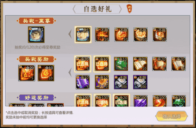 累计抽奖达120抽必定获得头彩-至尊奖励,获得至尊大奖后,仙术师们可选择是否重置好运添彩所有奖励。每次抽奖可获得5点鸿运祝点,鸿运祝点可用于商店中换取更多其他奖励!