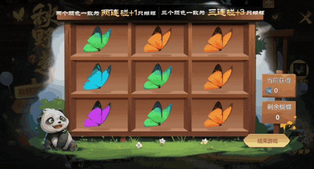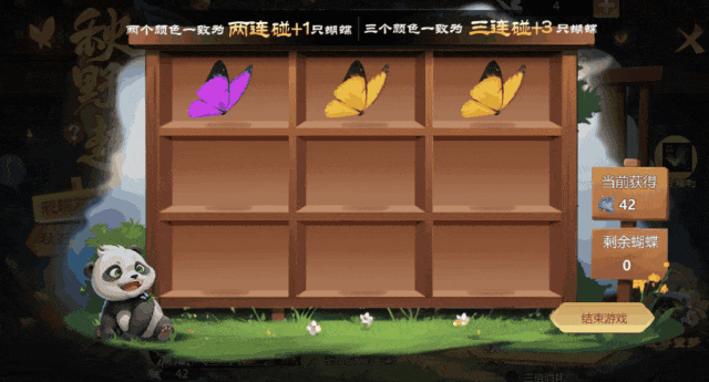 4、当全部格子内无颜色一致的蝴蝶,且剩余蝴蝶为0时,游戏结束进入结算。