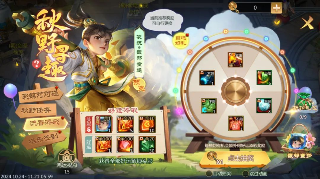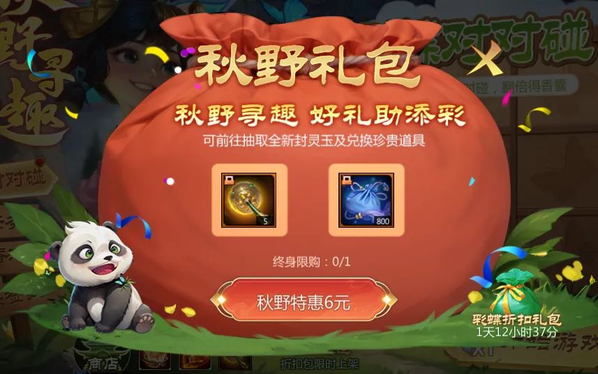 6元特惠秋野礼包上架,购买即有5抽,还可获得大量香囊,机不可失!(入口位于【彩蝶对对碰】界面右侧)