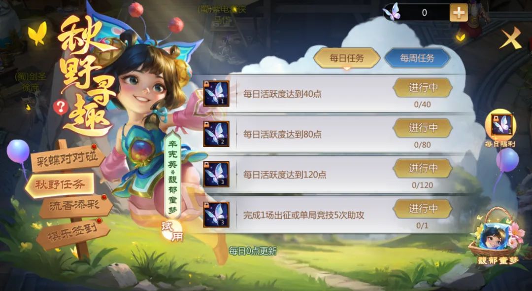 参与每日任务和每周任务可获得大量彩蝶奖励,彩蝶可用于前往彩蝶对对碰处游玩。每周任务还可获得流香锤奖励,可用于前往【流香添彩】中抽取豪华大礼!每日任务于每天0点更新,每周任务于每周一0点更新。