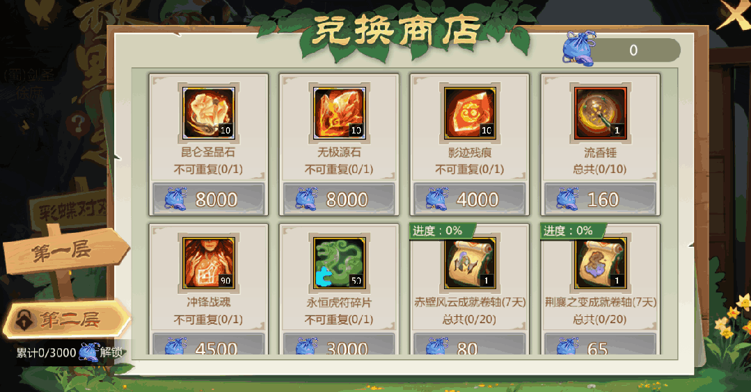 香囊兑好礼!兑换商店分为两层,第二层需累计获得3000香囊方可解锁。百炼封神石、流香锤、昆仑圣晶石、无极源石、各种暗金打造书、大量成就卷轴等丰厚好礼等你拿!!