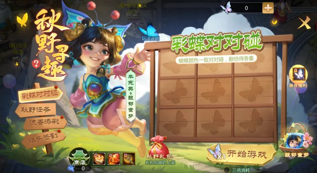 参与活动可获得彩蝶,使用1个彩蝶开启彩蝶对对碰游戏,碰得越多,额外获得的香囊越多!介绍如下——
