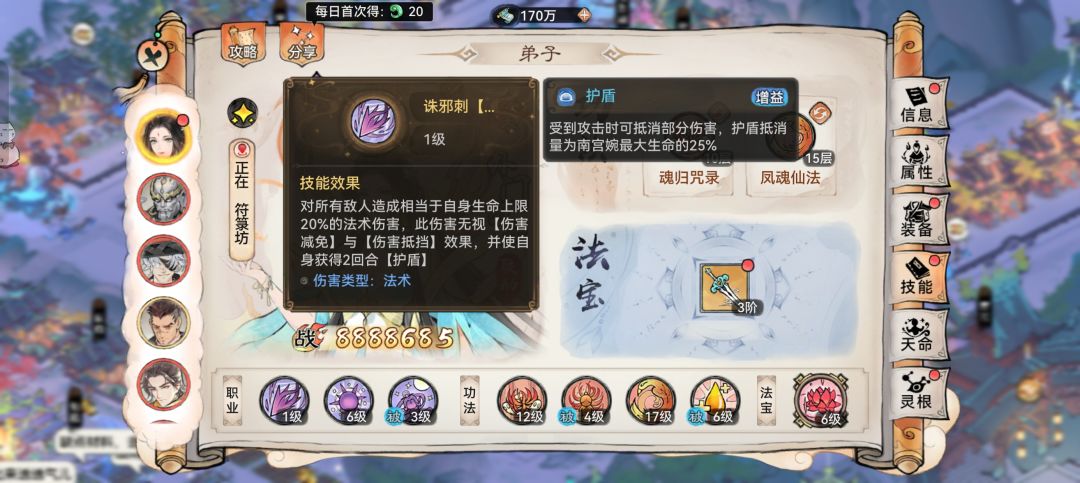 1. 角色定位:小编感觉这个角色可以输出,也可以当做抗伤位置培养,但是如果放在前排,生命上限被降低之后,就会影响道兵普通攻击的输出,这取决于他的道兵被动效果,其效果是将普通攻击转变为诛邪刺,对全体敌人造成20%生命值上限的伤害,比如生命上限被降低,这个伤害应该也会被降低。对面没有卫寒和天一,可以放在前面,她承受能力还是很强的,如果有类似技能的话,那就放在后排尝试一下,小编是放在后排的玩的。