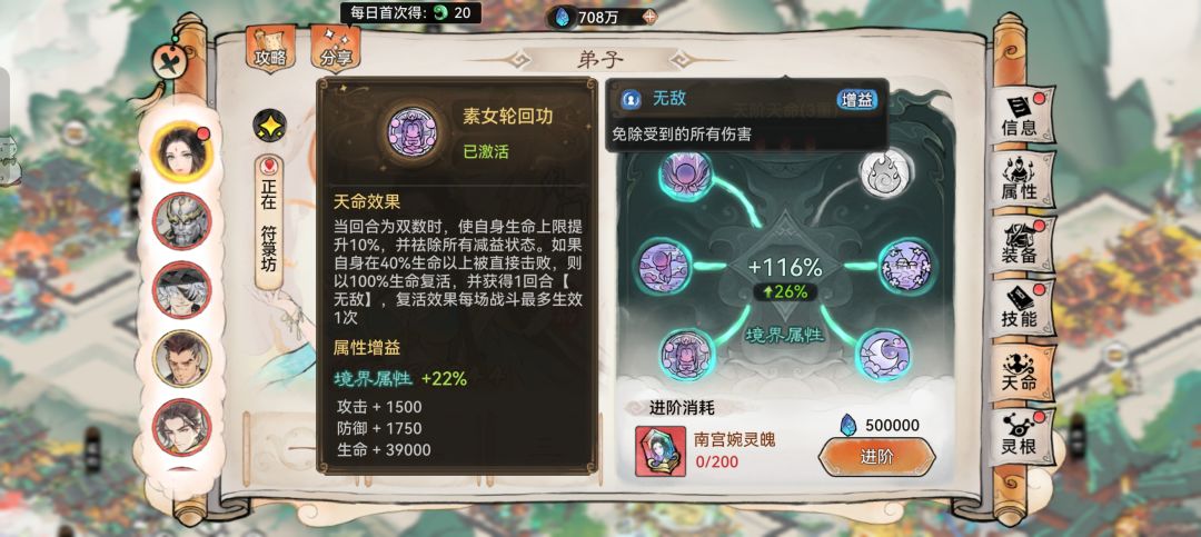 其还有一个其还有一个天命效果,自身处于护盾无敌状态受到攻击,可以吸收敌方全体相当于生命值上限10%的生命,降低敌方30%攻击力,这个又增加了其抗伤能力和辅助效果,在拥有道兵的状况下,几乎是每局都存在一定的时间存在护盾,这个天命效果也能稳定触发吸收生命值,降低对方攻击力属于减益受到效果命中影响,降低不了也问题不大。