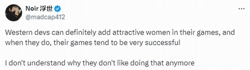 近日有推特网友发文称:“西方开发商绝对可以在他们的游戏中加入有吸引力的女性角色,而且当他们这样做的时候,他们的游戏往往会大卖。我不明白,为何他们不再喜欢这么做了”,这也在网上引起了玩家热议。