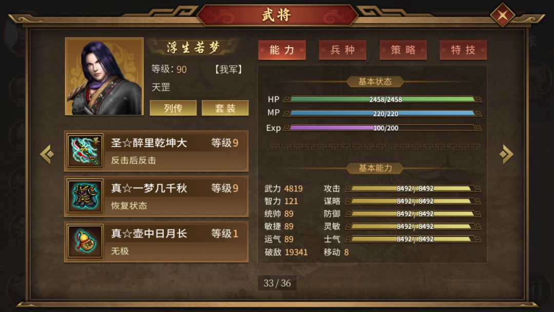 四:浮生府,个人感觉打过去的这几关最难的一关就是浮生府,当然也可能是因为是我的属性不够,第一次是六周目的时候去的,那时候浮生6000的属性,进去根本劈不动神浮生,然后就劝退了,接下来现在七周目的时候我居然发现正义勋章可以分解,一个勋章四个花雕酒,然后果断换了28个,买了三组大闸蟹来兑换大武力果,最后浮生勉强到8500,才过的,需要注意的就是先想办法弄死浮生,因为进去之后属性掉的太多,我是先利用回归,整体慢慢移动到红孩儿那边,利用浮生每回合会移动位置的破绽,想办法近身回归干掉,神杨戬不用优先处理,因为里面的小兵只要不移动到他的攻击范围内,小兵就不会主动攻击你,这样杨戬的天眼就没用了