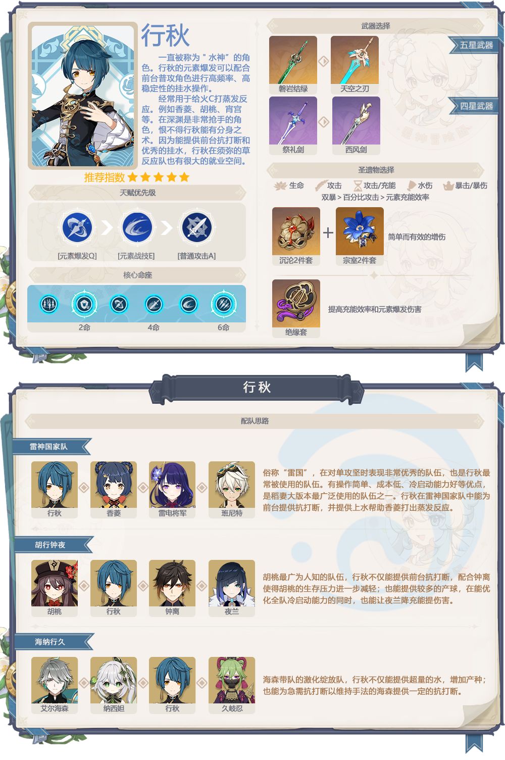 5、行秋抽取建议:行秋,1.0的角色,到现在依然非常好用,后台不俗的挂水,且为前台提供抗打断生存,无论 是绽放队还是蒸发队,都可以派上用处,0命完整,2、6命最佳,缺少后台挂水的玩家推荐抽一只。