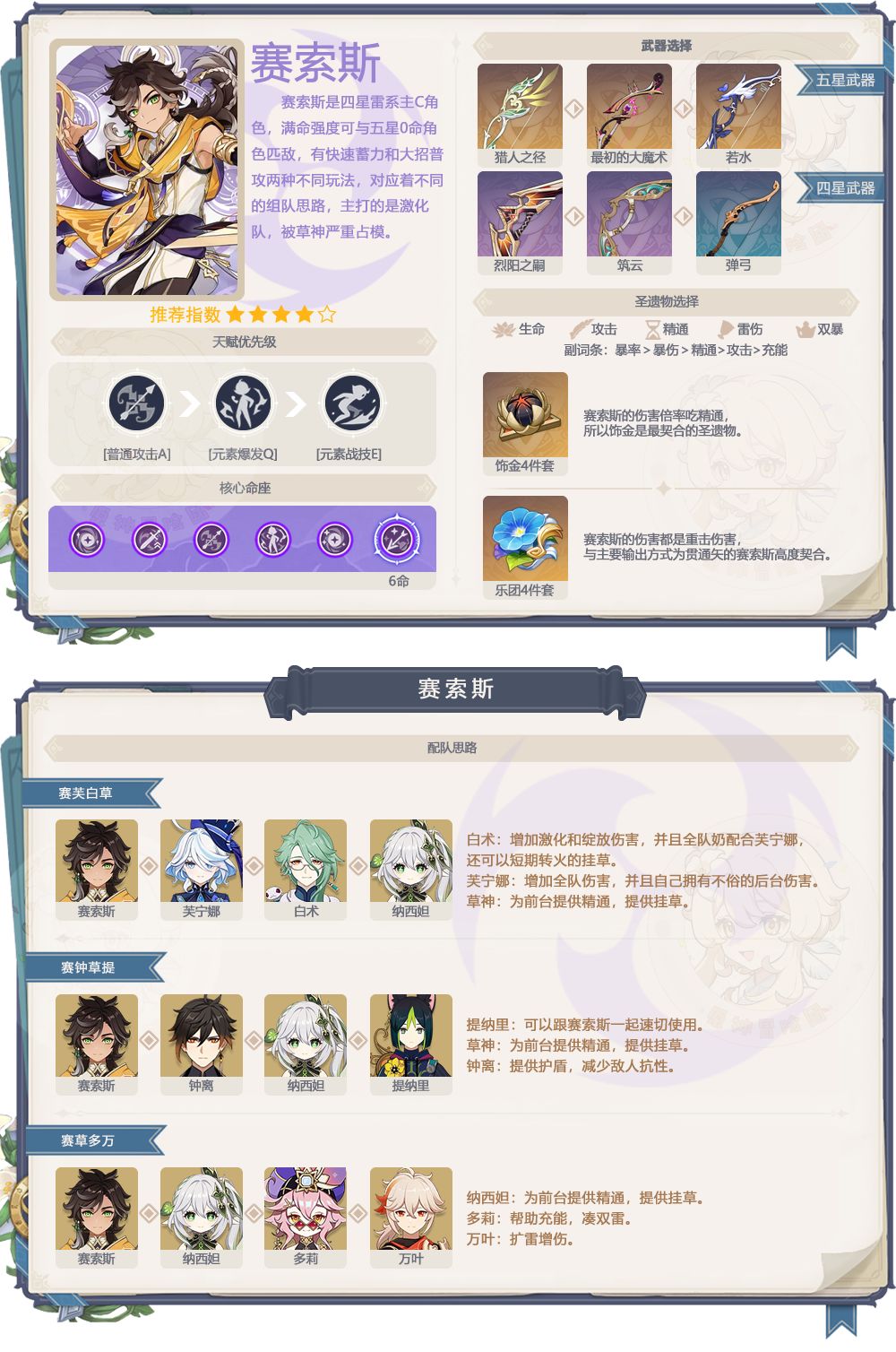 3、赛索斯抽取建议:赛索斯作为一个四星主C角色,在非满命不推荐抽取和培养,赛索斯在四星中输出能力位居前列,不过赛索斯想要发挥最佳效果,队友往往是五星角色,能凑齐相关队伍往往也不缺五星主C了,没有特别喜欢这个不建议特地去捞命座