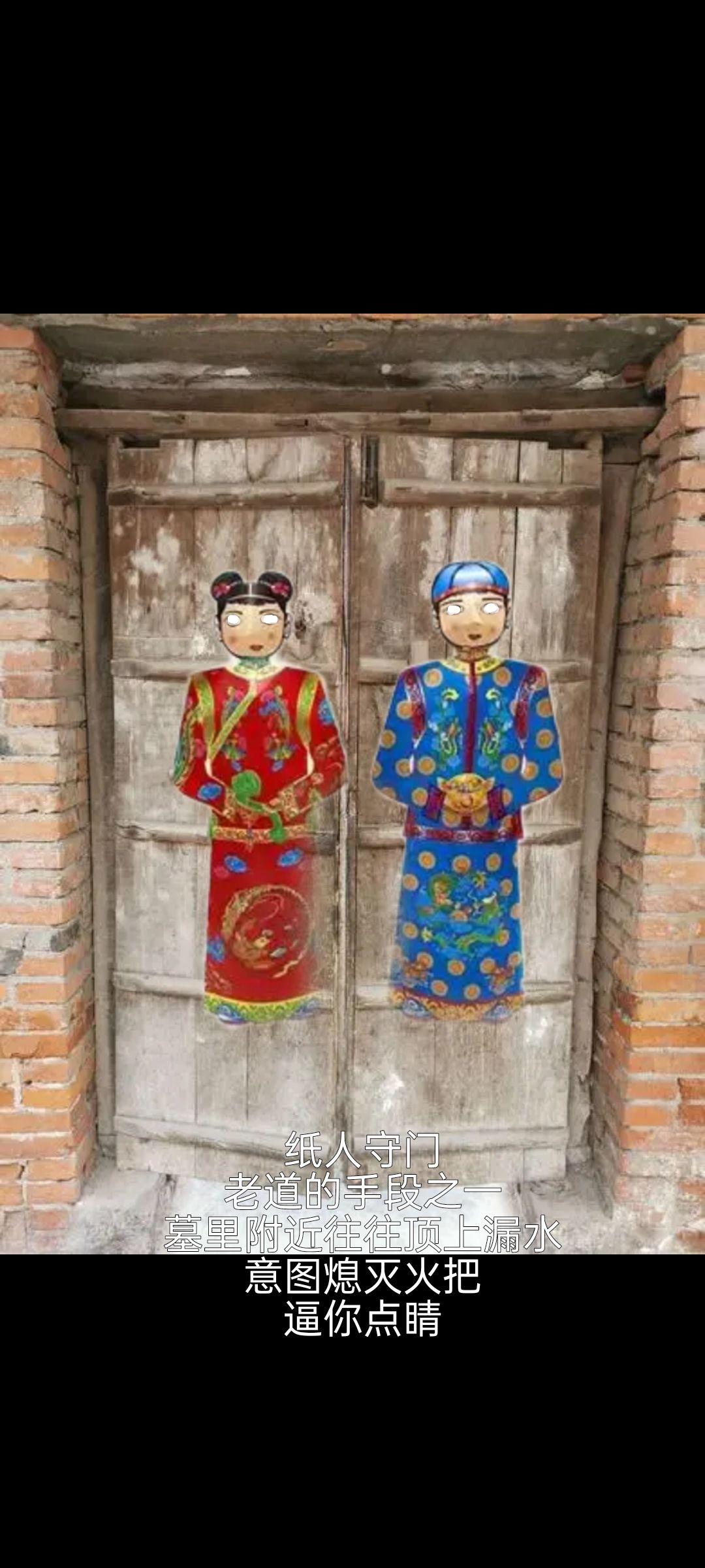 纸人介绍:(贴在门上童男童女,身着花花衣裳,白目红唇,死死封锁门后宝物)