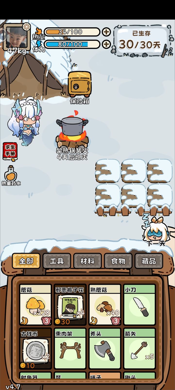 猎物很少,前期基本种地度过,吃作物,砍树,种地,出的蘑菇,浆果,海藻基本都烂掉催肥用。只出了一次海豹,没有熊都。蘑菇最后赌出很多,其实留腐烂物分开赌,成一个蘑菇基本就稳了,爱斯基摩人也就来了一次。冰也没有化出很好,很普通的运气,中猎物都很少,因为猎物少,羽绒服越比辣椒酱容错高。