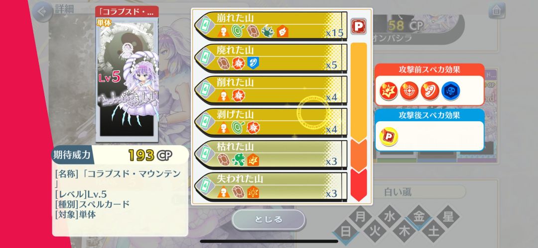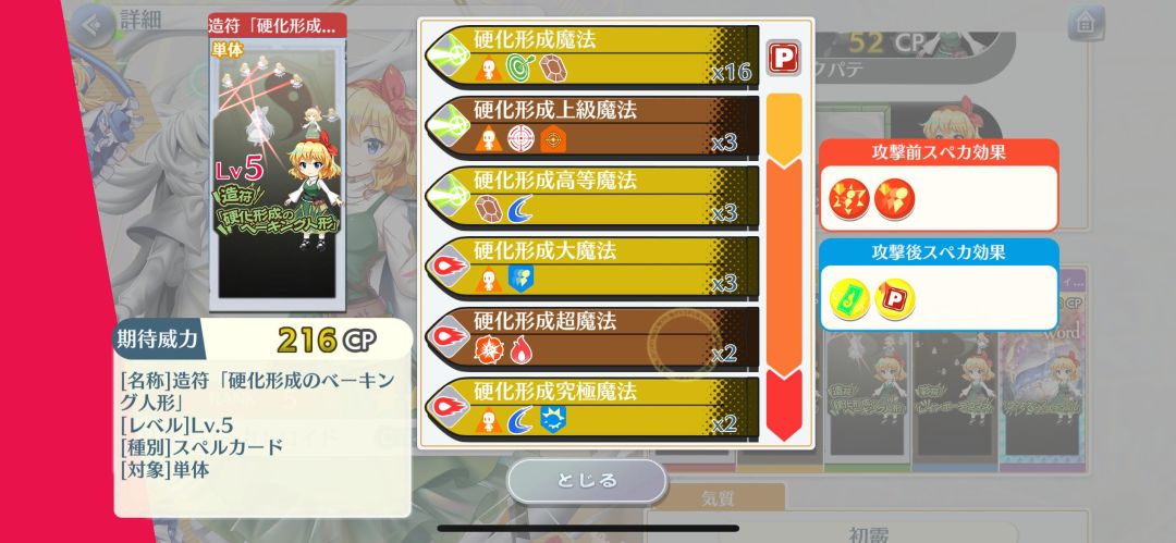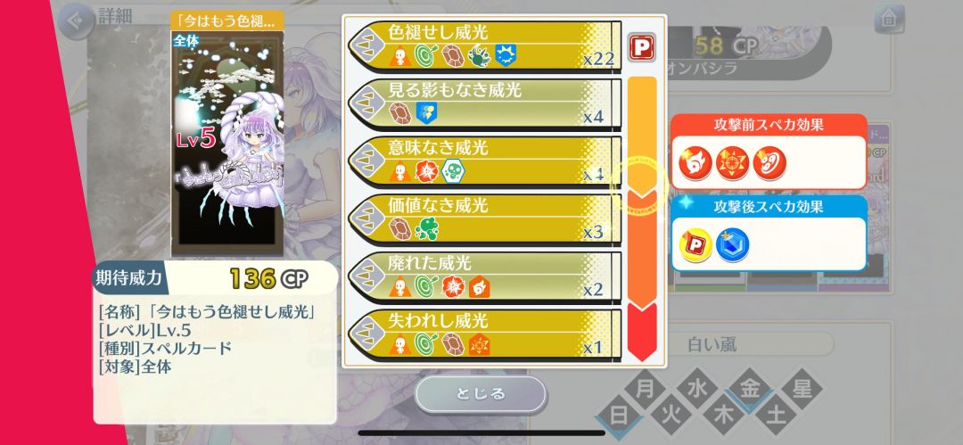 6段:魔法之森、人里、巫女、魔法使、骚灵、阴阳玉、文化特典、秋,(和小卡种类是一样,非常窄的特攻)