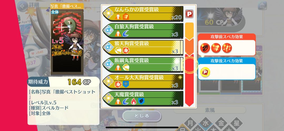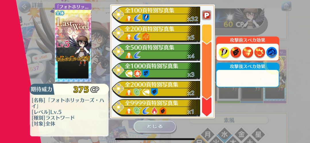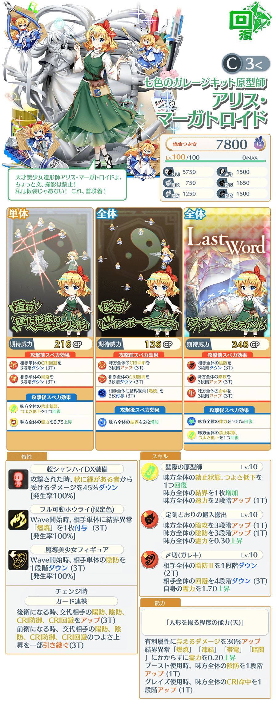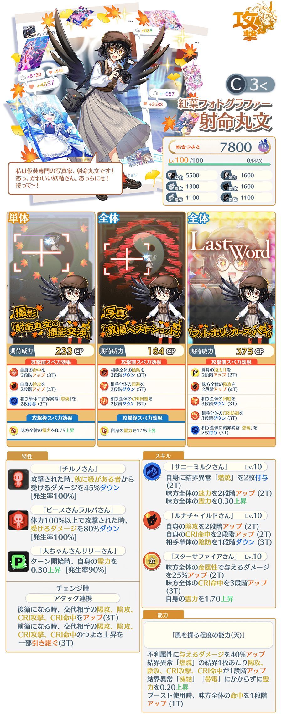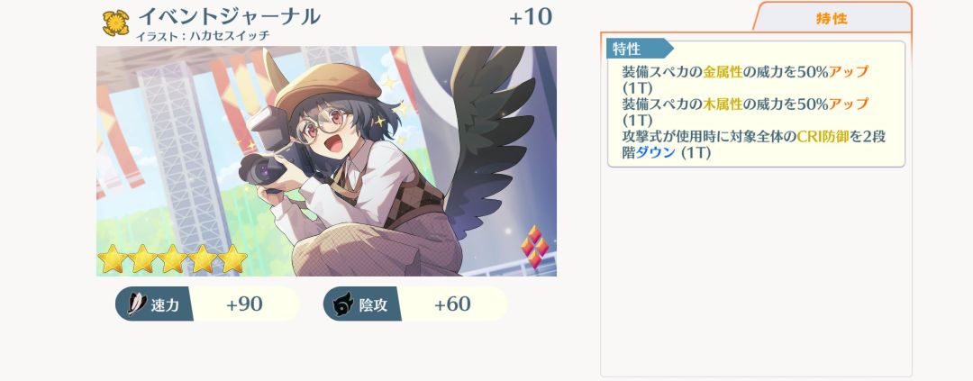 效果:光弹50%,回复式使用时己方全体CRI攻击4段up(3T),回复式使用时己方全体CRI命中4段up(3T),