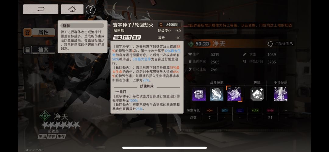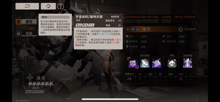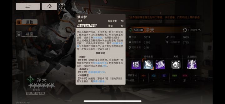 信性强攻角色,被动:净天有两种形态(净天/兽主)净天形态下每次收到治疗会获得免伤和攻击,兽主血量越低伤害越高,最高加40%。普攻:净天普攻时倍率很低,造成5%生命的自疗。兽主普攻倍率很高,造成5%生命自伤。净天使用战术技会切换为兽主并造成一次兽主普攻,兽主战术会切换为净天并造成一次净天普攻。净天大招倍率很低,对自身造成12%生命的自疗,之后每次攻击50%概率回复5%生命(一命100%)兽主大招倍率极高,造成15%自伤。生命越低双爆越高,最高增加25%(一命翻倍)