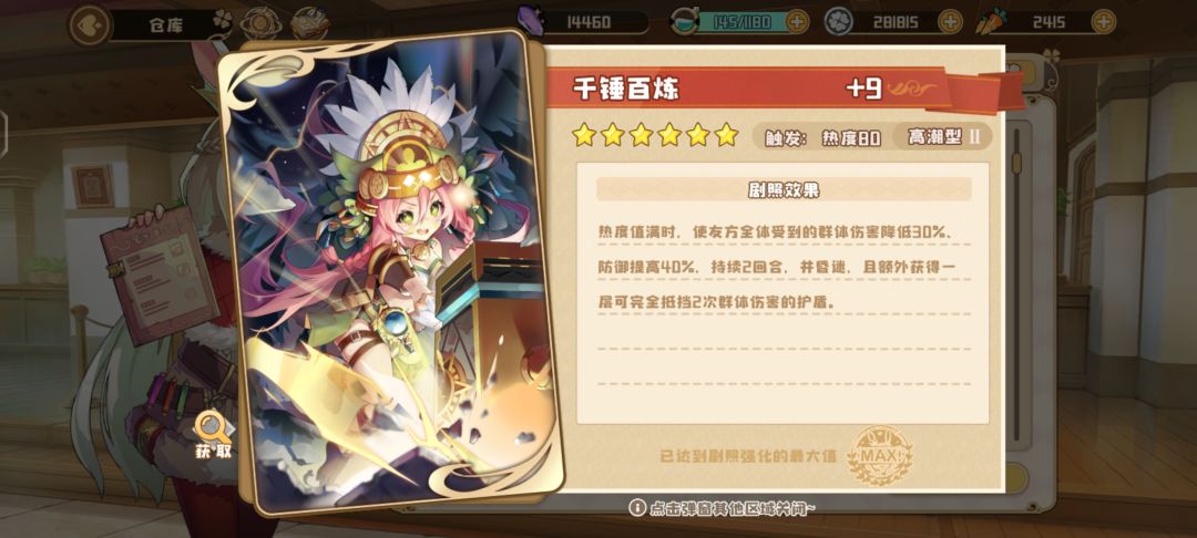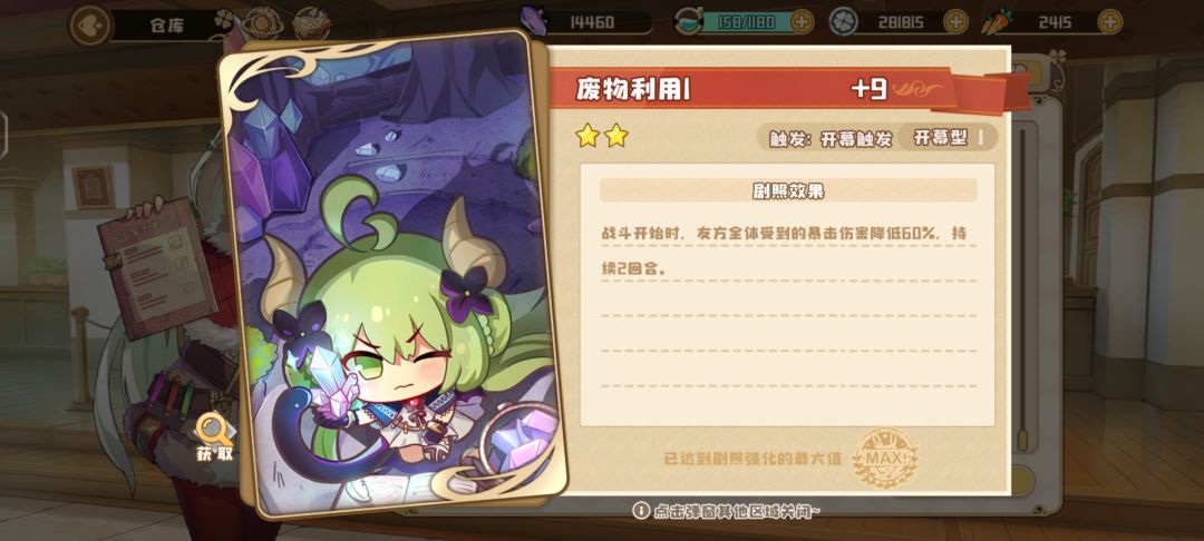 4.芭芭雅加,精华兑换,穿勇者套(图2,次元竞演商店兑换,他输出靠大招的巫毒,不用暴击),一般配剧照宿敌2(图3,因为前面勇者套可以让芭芭雅嘉成为队伍里攻击最高的角色,所以吃的到宿敌二,可以频繁开大),抗不住就用剧照千锤百炼(图4)。