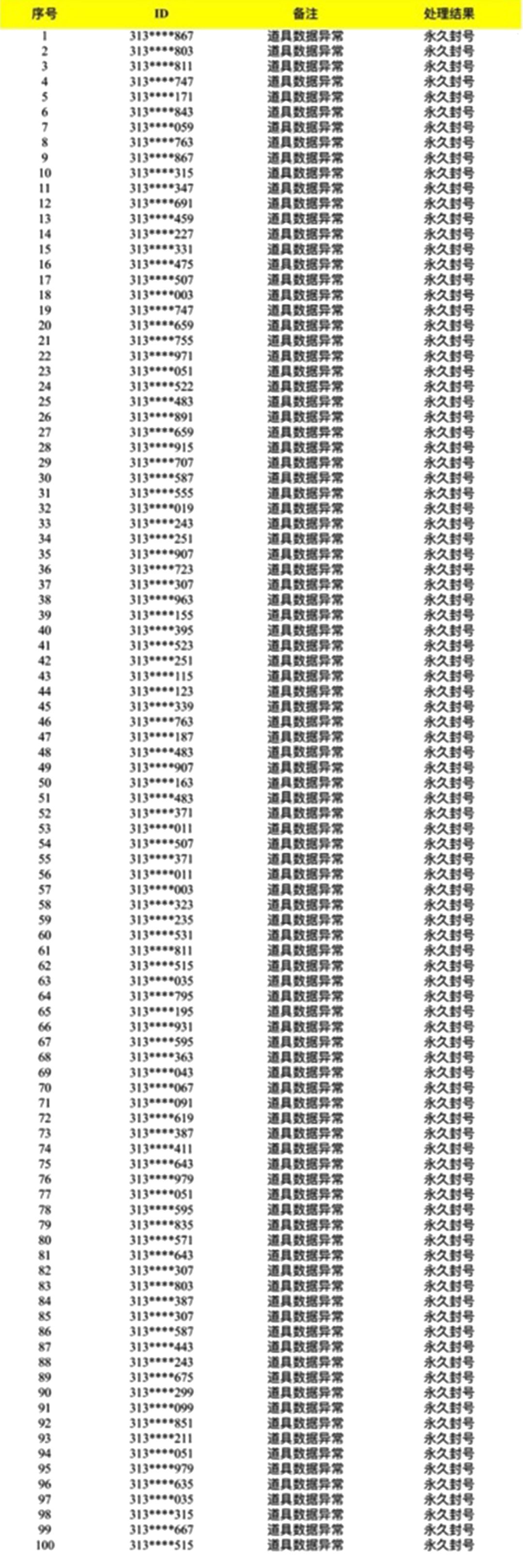 本次行动针对部分渠道账号进行核实,从严查处游戏内数据异常行为,市政工已收集了相关违规账号信息,并对这些玩家进行了永久封号处理,将于此公告中予以公示。