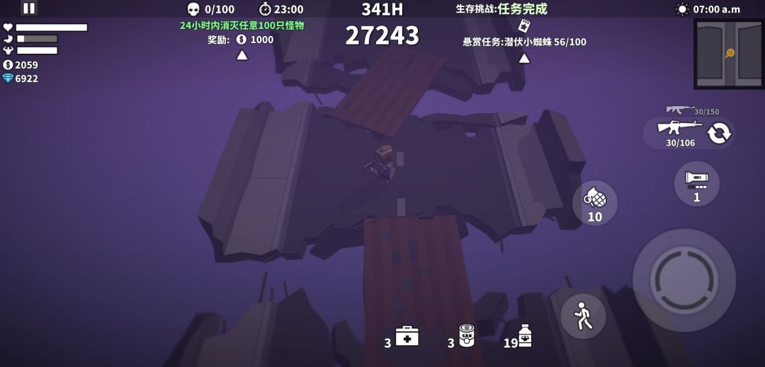 枪带M16加AK,人物女主播,大家前期经量升级物资定位和减少负面效果,前期能杀就杀,不要心疼弹药,到了200分钟的时候,经量边缘清理怪物,保证自身血量健康,还要保证自身罐头有两个,女主播一个罐头大约是30分钟,到了270的时候,捡物资,保证自身罐头到三个,然后躲在桥上猥琐到360分钟即可。拿到奖励