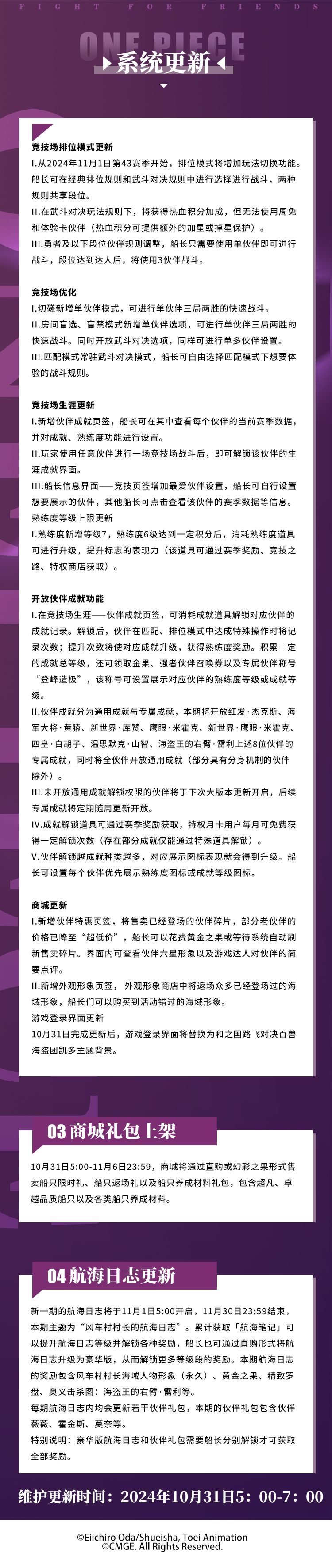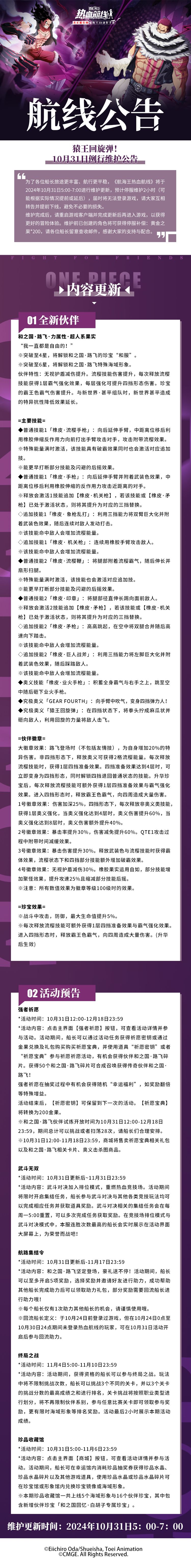 为了各位船长旅途更丰富、航行更平稳,《航海王热血航线》将于2024年10月31日5:00-7:00进行维护更新,预计停服维护2小时(可能根据实际情况提前或延后),届时将无法登录游戏,请大家互相转告并提前下线,避免不必要的损失。