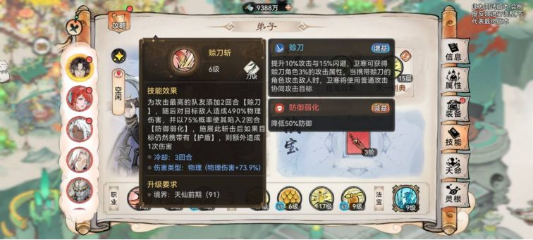 卫寒的被动技能"命途轮转",每回合结束时积攒刀意配合天命,可以更快释放'因果斩尽',刀意+赊刀的加成进一步提高其伤害。