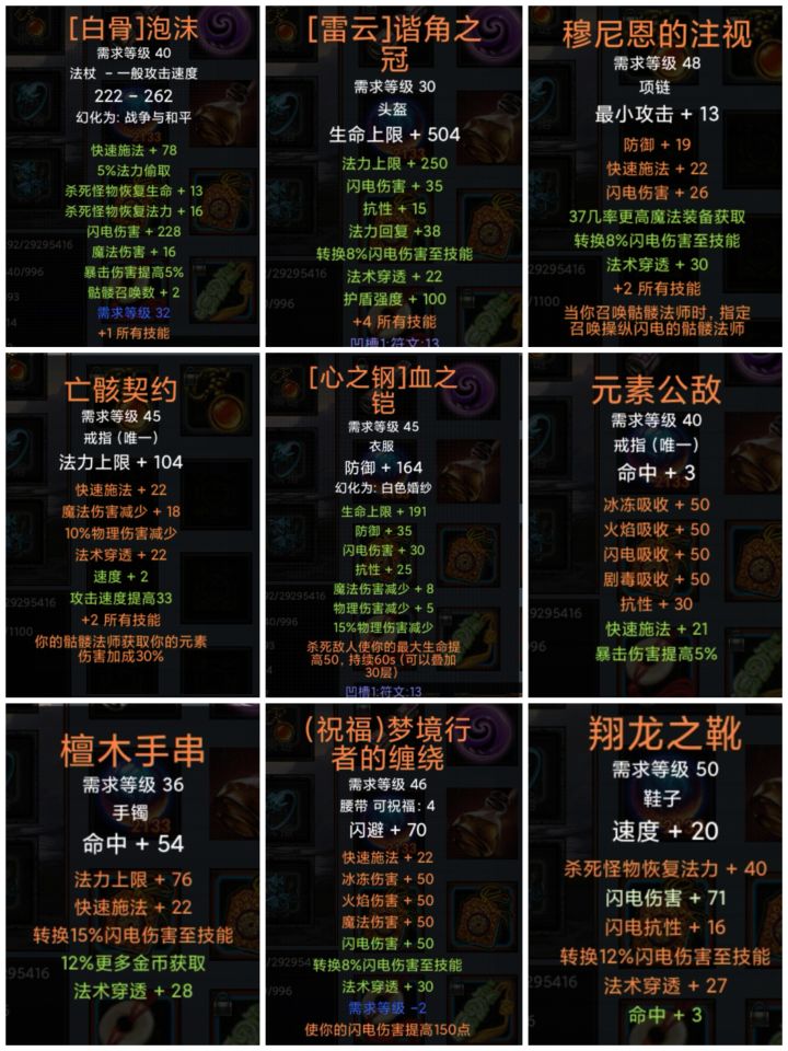 5.戒指:前期施法速度的蓝黄戒指,双施法黄泉戒指;后期:亡骸契约,元素公敌。