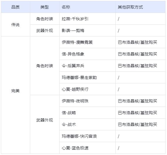 例:引航者在2024年2月1日开启的「意识重构-千秋岁引」中只获得了影袭武器外观「一剪梅」,其在2024年10月31日复刻的「意识重构-千秋岁引」中首次获得传说品质时装/外观时,将必定获得拉薇角色时装「千秋岁引」。